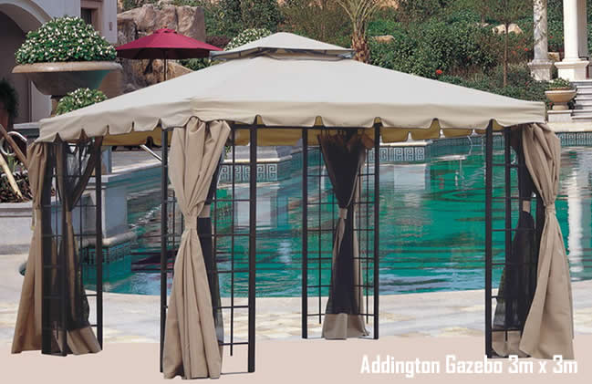 Truly innovative in design and exclusive to our company, the Addington luxury gazebo will stand with grandure, clearly defining your outdoor entertaining. This superb gazebo has a steel and aluminium frame coated in a dark copper brown colour powder coating, which bolts together and has a footprint measuring 3m x 3m which can also be secured to the ground if required.